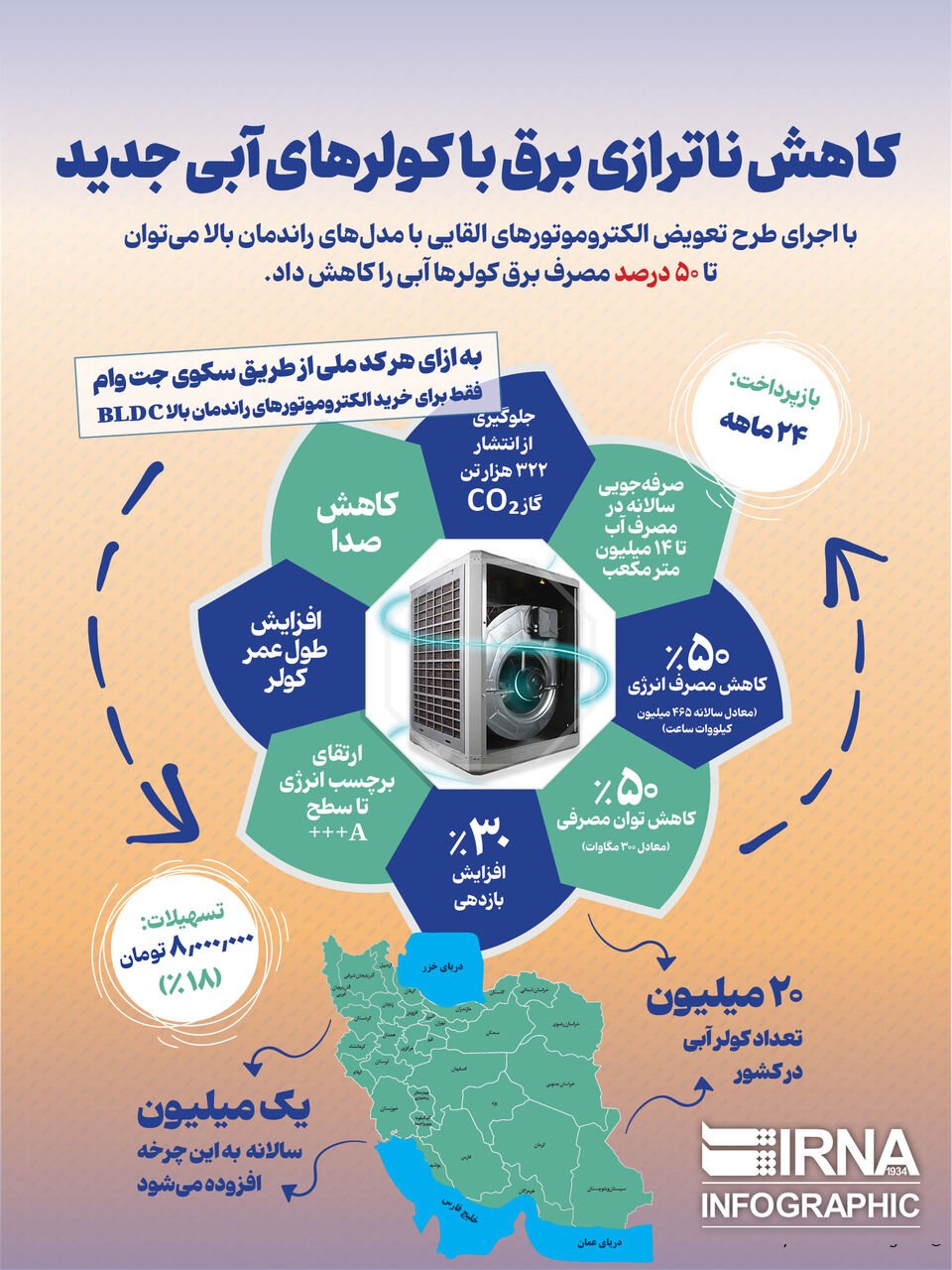 سالیانه یک میلیون کولر آبی جدید به چرخه مصرف برق افزوده می شود و با اجرای طرح تعویض الکتروموتورهای القایی با مدل‌های راندمان بالا می‌توان تا ۵۰ درصد مصرف برق کولرها آبی را کاهش داد.